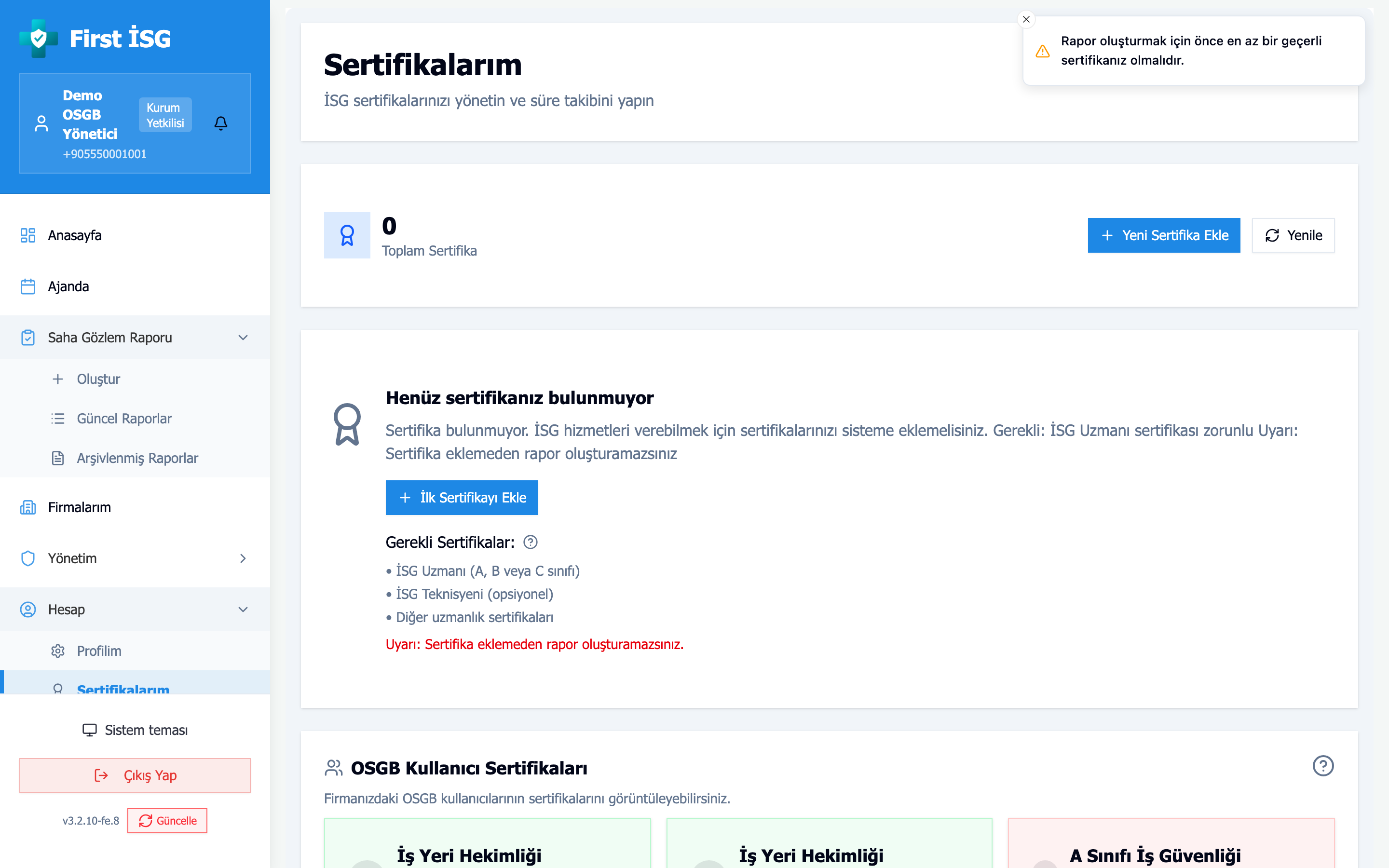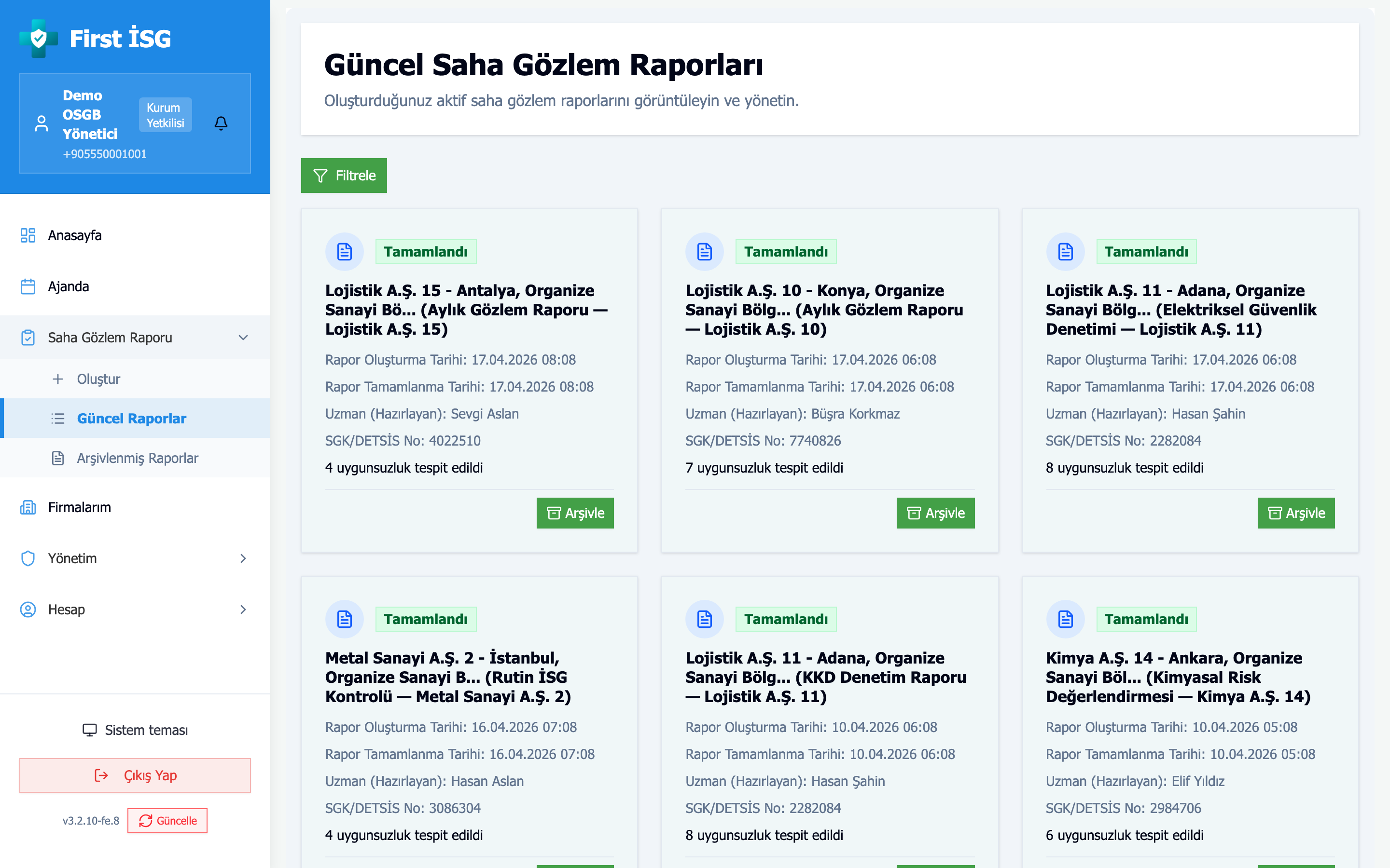 Demo OSGB hesabında 149 örnek rapor ve 735 AI-destekli uygunsuzluk bulgusu var. Tek tıkla girip gerçek çıktıya bakın — kendi sahanız için nasıl çalışacağını 3 dakikada görürsünüz.