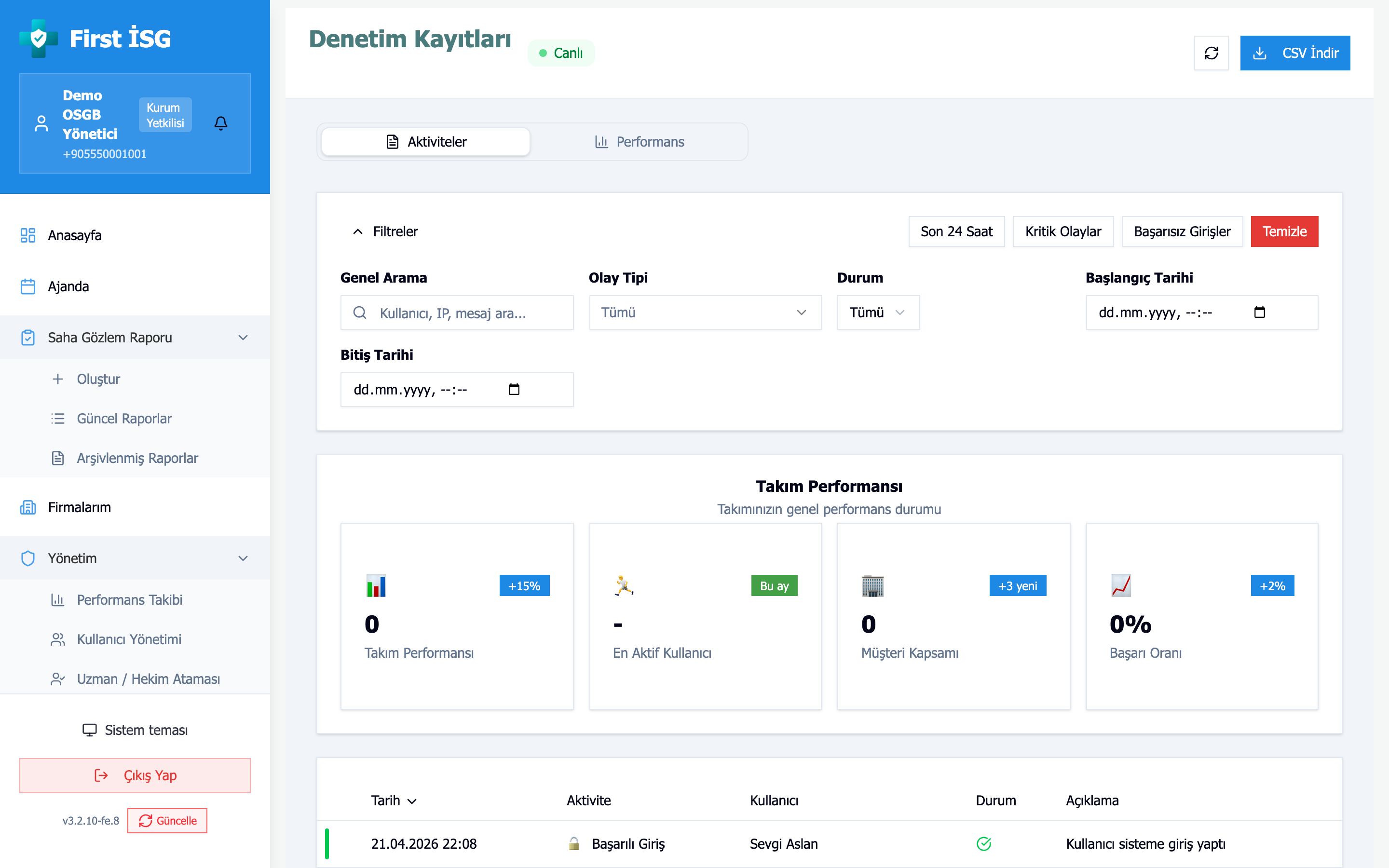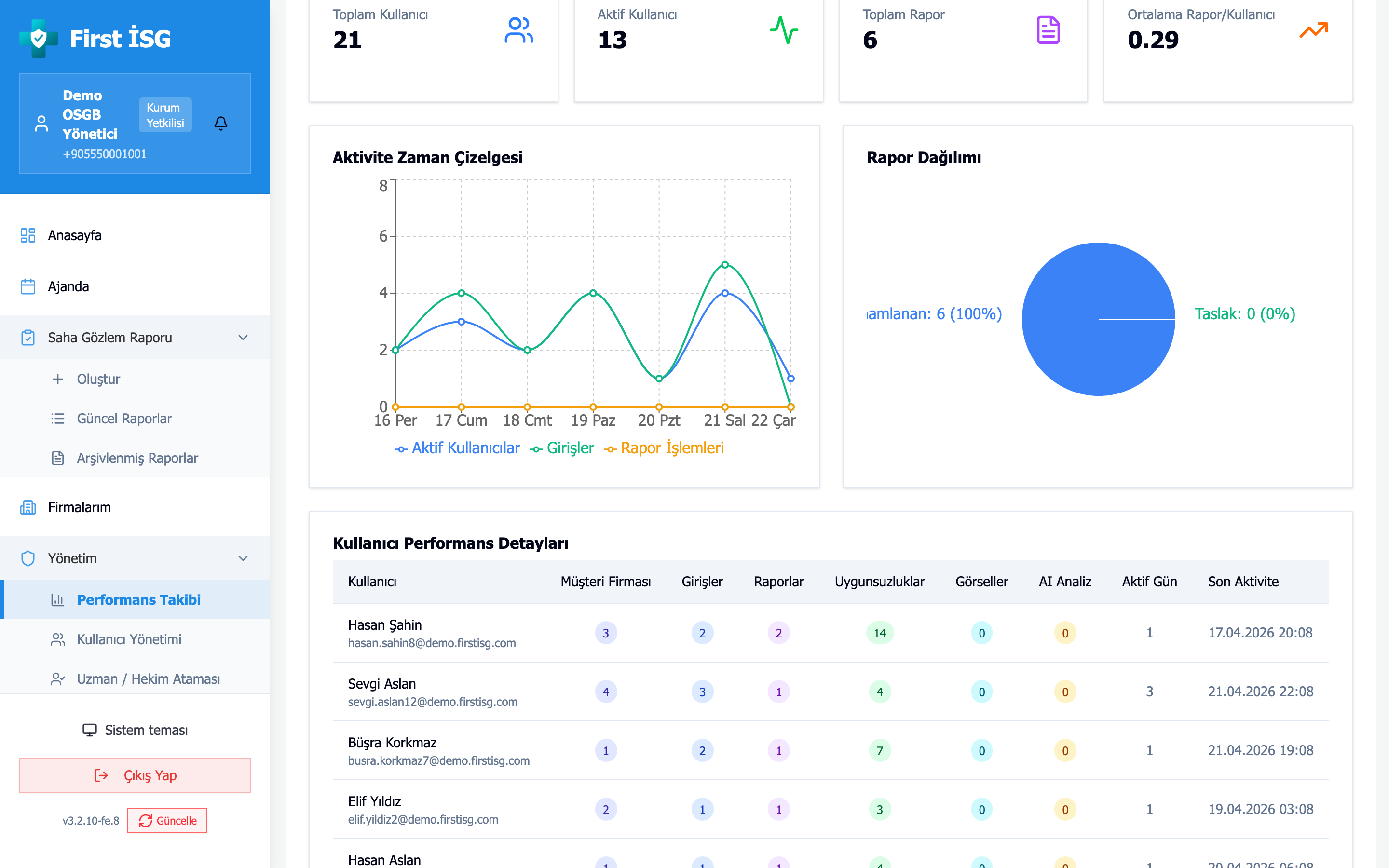 Demo hesapta 21 kullanıcının son 6 ayda yaptığı 485 giriş, 149 rapor ve 735 bulgu üzerinden performans dashboard'u işliyor. Filtreleri oynatıp "bir OSGB yöneticisi için günlük kontrol ekranı" nasıl bir şey görün.
